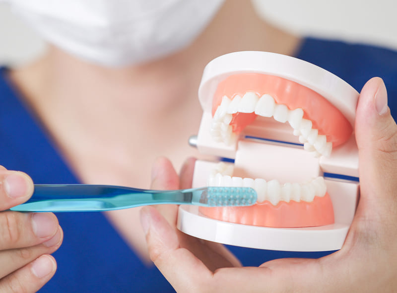 歯の磨き方やブラシの当て方を丁寧に確認し、歯ブラシだけでなくデンタルフロスや歯間ブラシの使い方もアドバイスします。